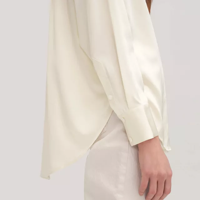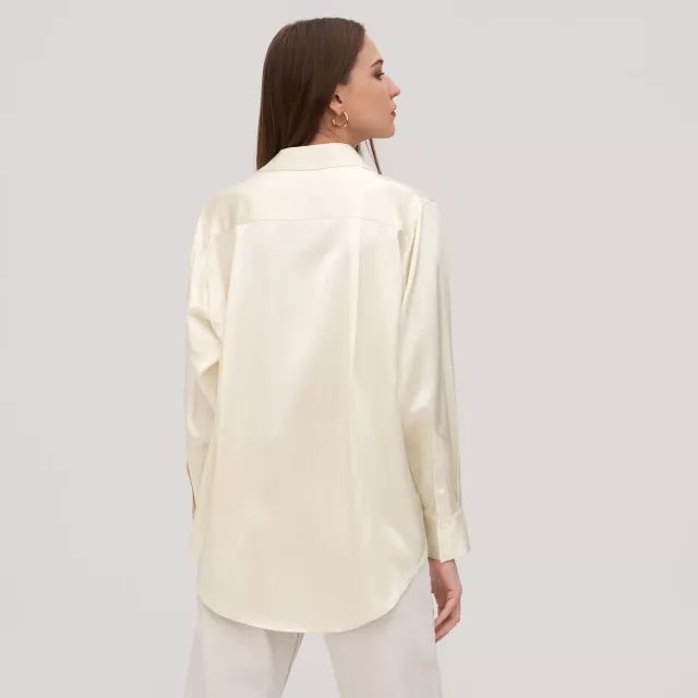 Our Silk Oversized Blouse stands out for its premium 22 momme charmeuse silk, offering a blend of luxury, durability, and comfort. The blend of menswear inspiration with a relaxed, feminine fit creates a unique piece that’s both empowering and elegant. It’s not just a blouse; it’s a statement of sophistication and self-expression.
