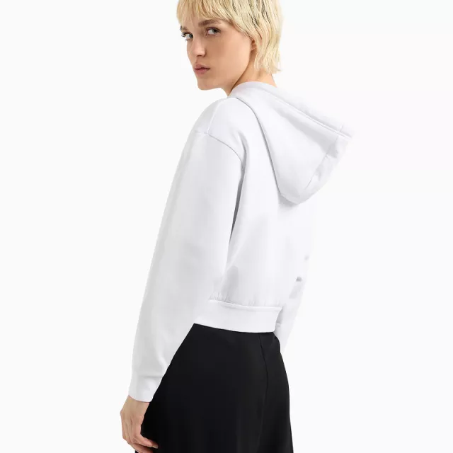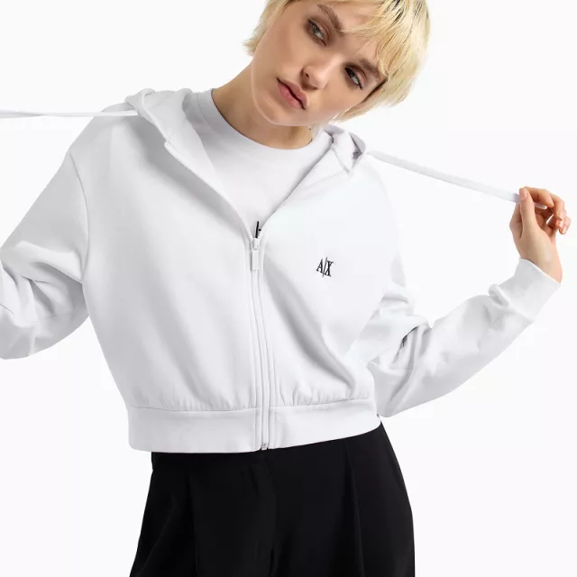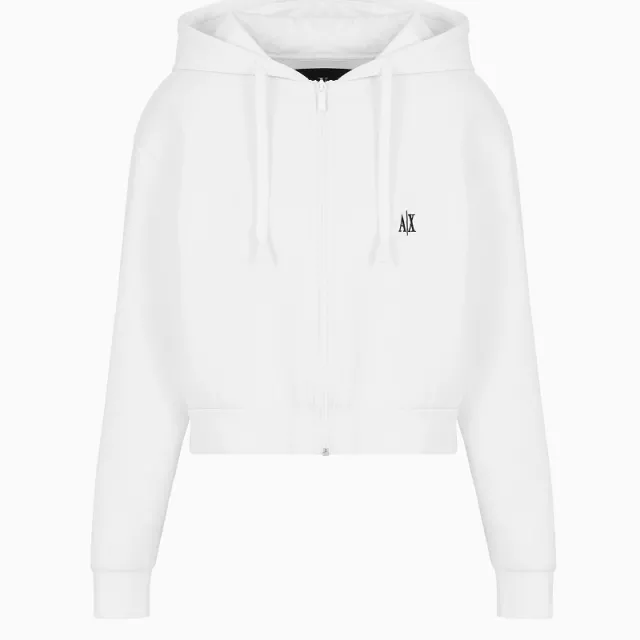 This Armani Exchange sweatshirt features a sleek zip-up front, allowing for easy layering and versatile styling. The round neckline and hood add a relaxed, sporty vibe, while the long sleeves provide just the right amount of coverage for breezy evenings. Crafted in a crisp white shade, it pairs effortlessly with any outfit, making it a wardrobe staple you’ll reach for again and again.