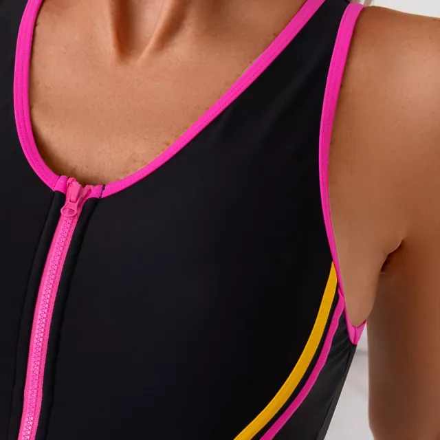 Featuring a flattering V-neckline and front zipper detail, this swimsuit sculpts your silhouette while allowing for easy wear and removal. The contrast color design adds a dynamic, energetic vibe, while the sleeveless cut and wide shoulder straps ensure unrestricted movement. The soft, stretchy fabric hugs your body like a second skin, while built-in padded cups give you shape and support where you need it most.