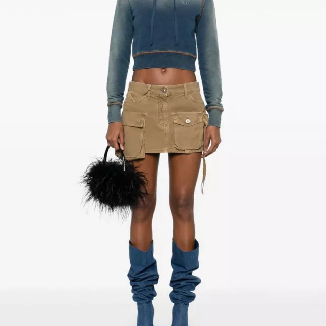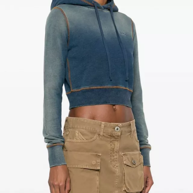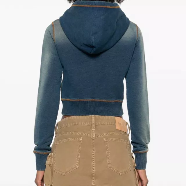 This cropped Diesel hoodie is perfect for casual days, transitional weather, or layering with high-waisted jeans or joggers. Throw it on over a tank or tee for a relaxed daytime look, or pair it with a puffer vest and sneakers for street-style edge. Its versatile navy tone makes it easy to mix and match with both neutrals and brighter pops of color.