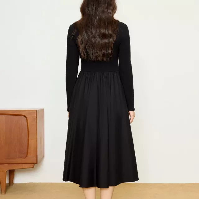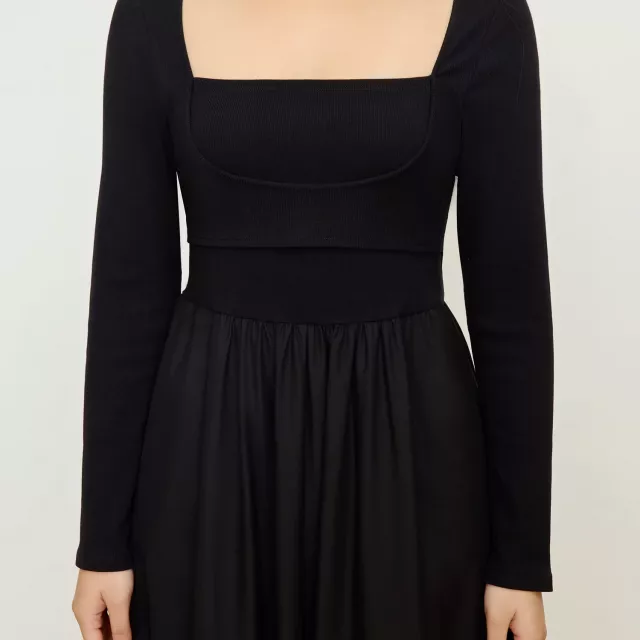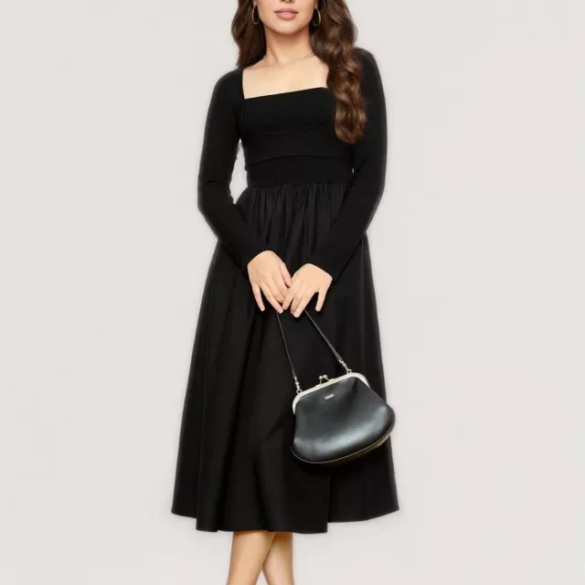 Step into timeless sophistication with this elegant black long-sleeve dress, designed for women who appreciate effortless style and comfort. Featuring a flattering square neckline and a graceful A-line silhouette, this dress offers a polished yet modern look perfect for both work and formal occasions. The unique patchwork detailing adds a subtle touch of texture, making it a standout piece in any wardrobe.