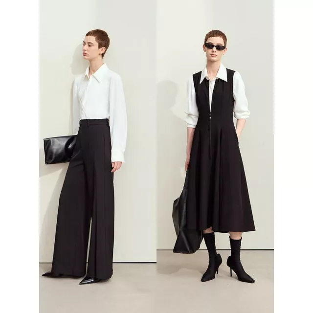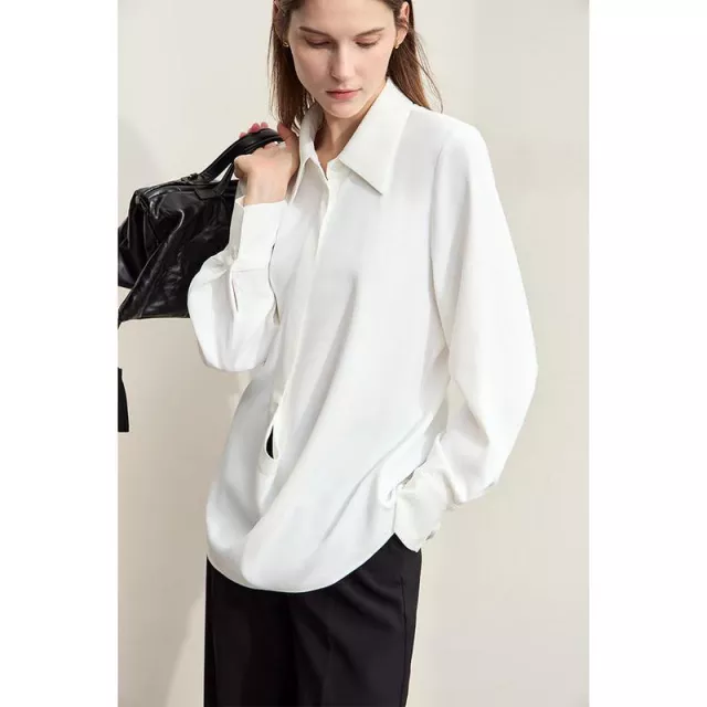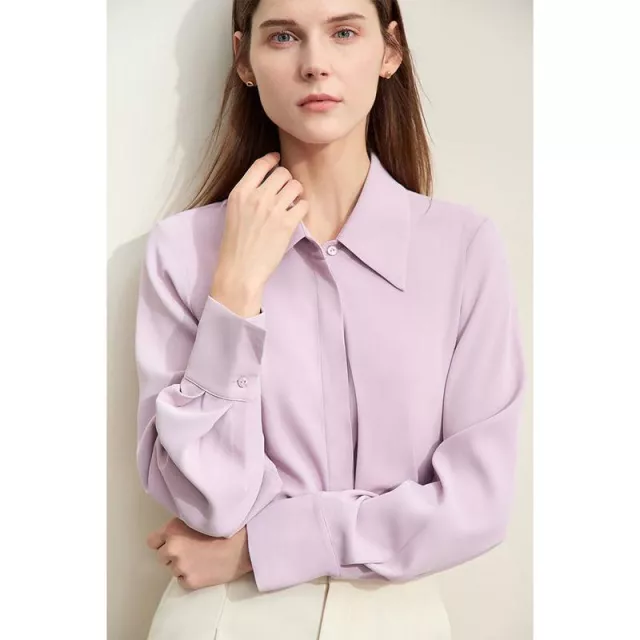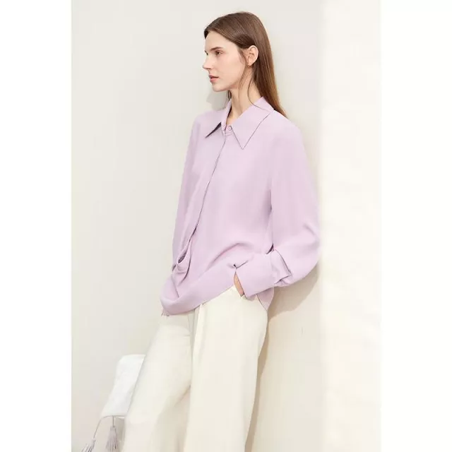 The blouse’s midweight construction makes it versatile enough for any season, while the full-length sleeves and turn-down collar contribute to its sophisticated charm. The covered button closure adds an elegant touch without disrupting the clean lines of the design. Whether you’re dressing up for a meeting or going for a laid-back look, this blouse effortlessly adapts to your needs.