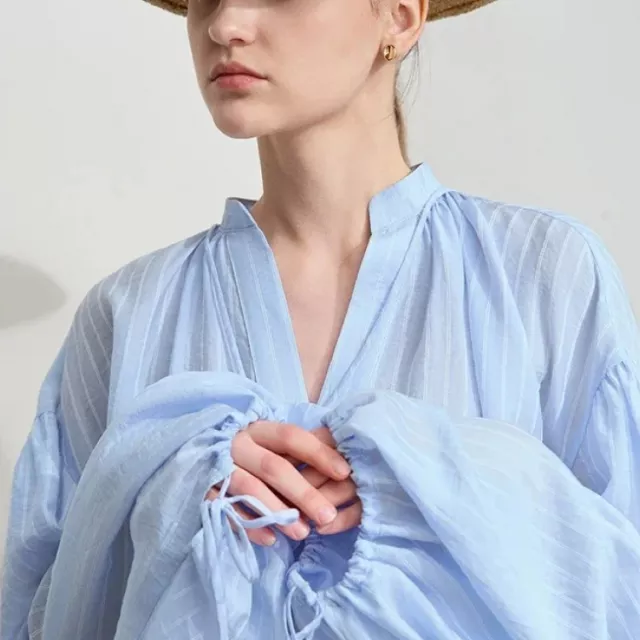 This minimalist chiffon blouse is a timeless piece that enhances your style with its simple yet chic design. Made from high-quality materials such as Lyocell, polyester, and nylon, it promises both durability and comfort. The full-length lantern sleeves are the star of the show, adding a touch of drama and flair to the otherwise simple design. The stand collar and lace-up detailing at the neck create a refined look that complements any outfit.