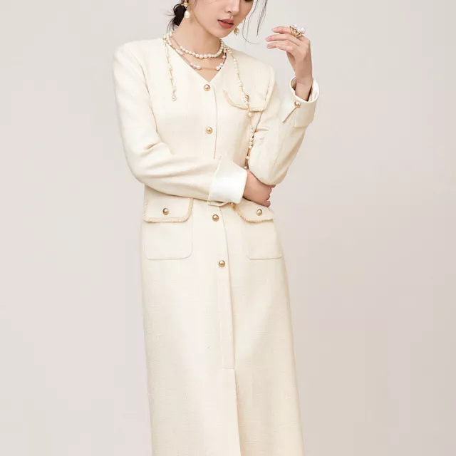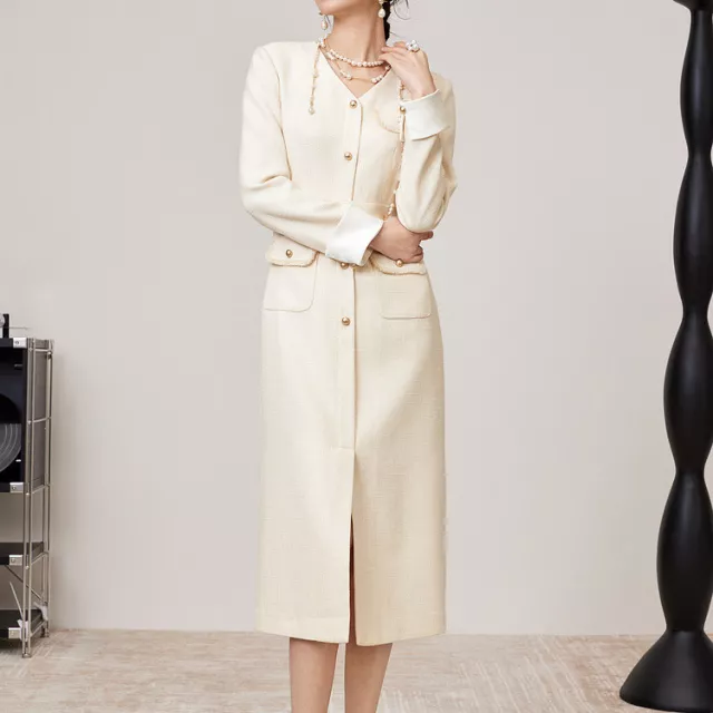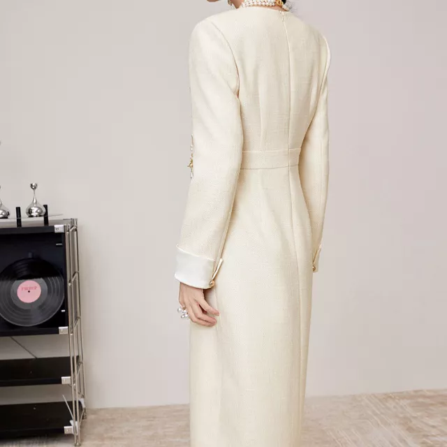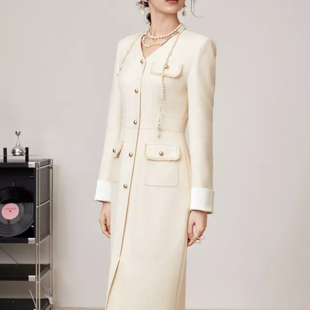 Embrace sophistication with this luxurious tweed midi dress, designed for the modern woman who appreciates elegance and class. With its tailored silhouette, deep V-neckline, and refined button details, this dress exudes confidence and grace. The long sleeves provide warmth for autumn and spring, while the subtle split hem adds a touch of femininity and movement. Whether you’re attending a formal event, heading to the office, or enjoying an upscale evening out, this dress ensures you make a lasting impression.