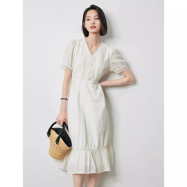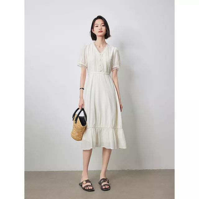 Crafted from lightweight chiffon, this dress drapes beautifully over your body, offering a flowy yet structured A-line silhouette. The non-stretch fabric enhances its shape, while the V-neckline elongates the neckline for a poised and feminine look. The delicate puff sleeves bring a hint of vintage charm, making it an irresistible blend of classic and modern fashion.