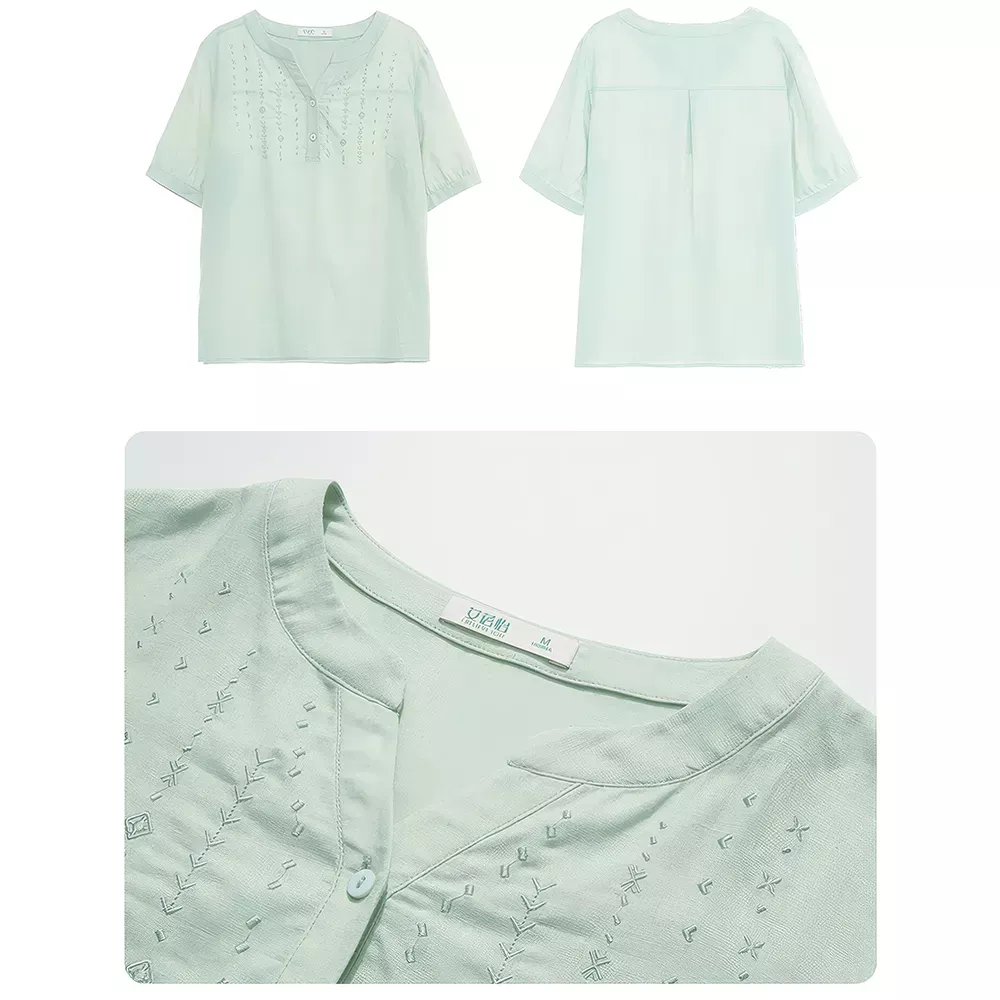 Step into elegance and sophistication with our French Unique V-neck Women’s Blouse, a stunning addition to your summer wardrobe. Crafted with meticulous attention to detail and adorned with exquisite Chinese embroidery, this blouse seamlessly blends timeless style with contemporary charm.