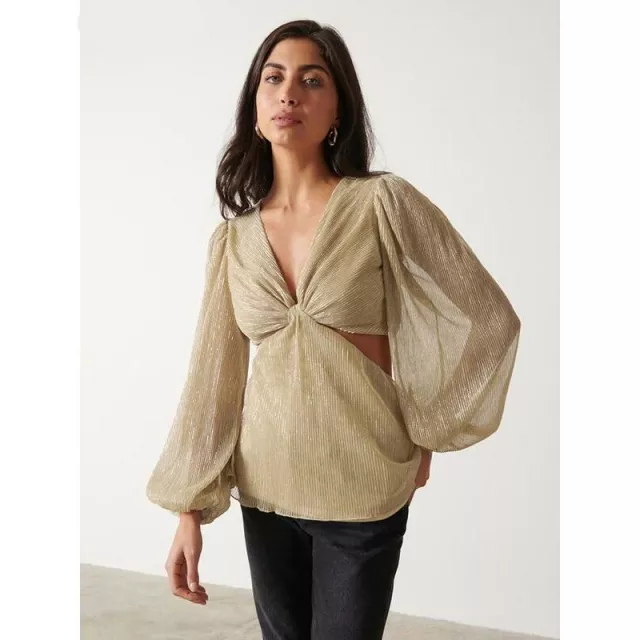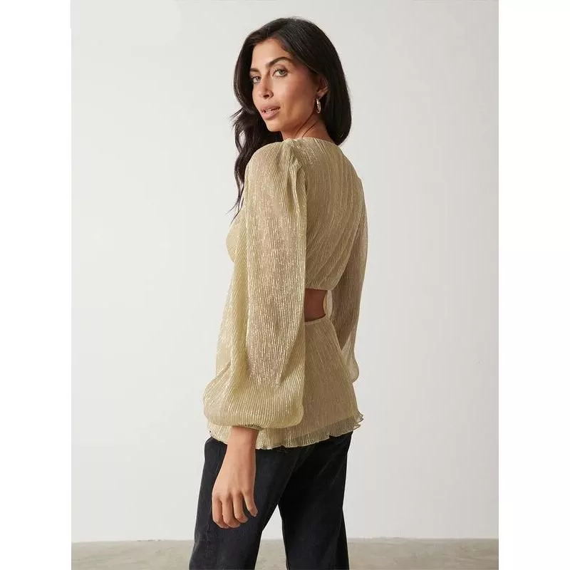 Gold Pleated V-Neck Blouse with Puff Sleeves
