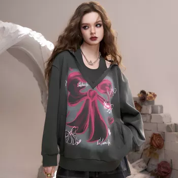 Gray Bowknot V-Neck Hooded Sweatshirt for Women