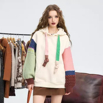 Contrast Color Hooded Knitted Patchwork Sweatshirt for Women