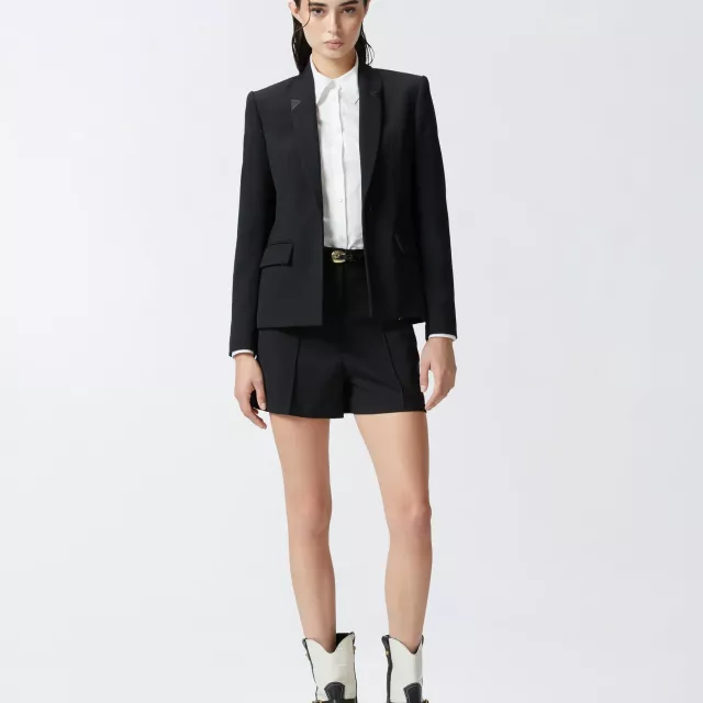 Crafted in a luxurious mix of polyester, wool, and elastane, these shorts offer a breathable and lightly structured fit. The black color makes them endlessly versatile, perfect for pairing with anything from a crisp white blouse to a colorful tee. Whether you’re headed to a weekend brunch, a summer party, or a casual day out, these shorts bring sophistication to any look.