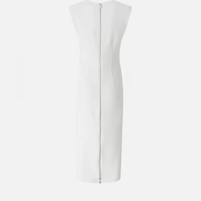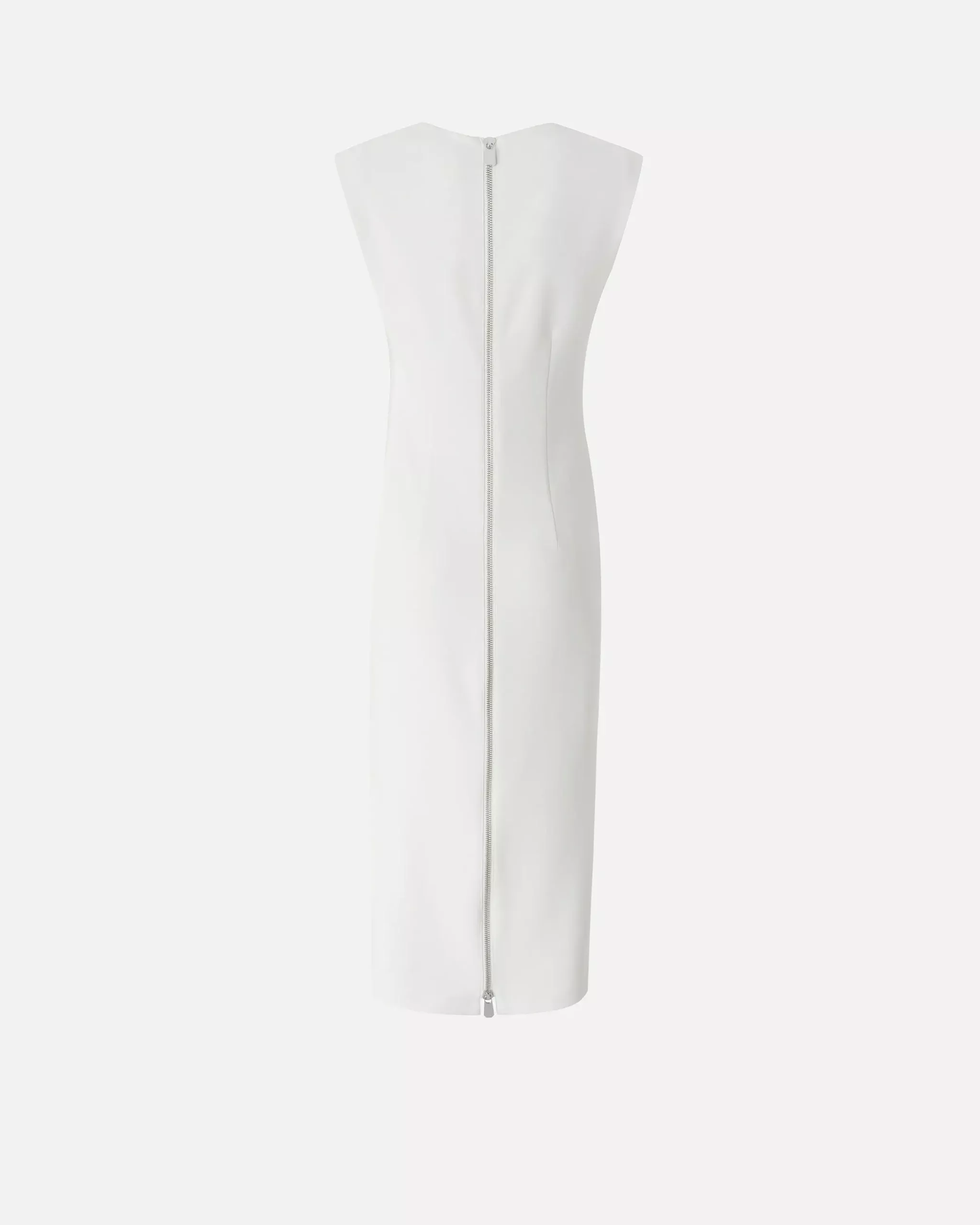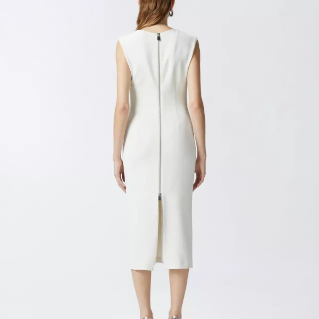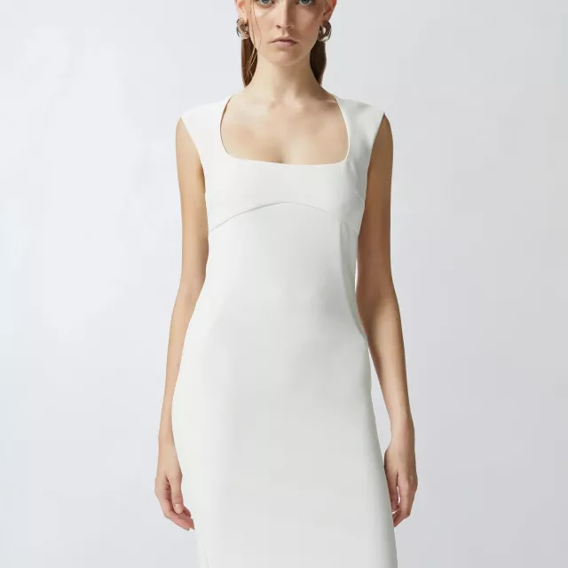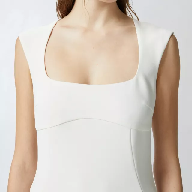 The dress features a square neckline that adds a refined touch while subtly enhancing your neckline and shoulders. The sleeveless design offers airy comfort on hot days, while the discreet zip fastening ensures a smooth, secure fit every time. Crafted from a soft blend of 94% polyester and 6% elastane, this dress has a light stretch that hugs your body just right — striking the perfect balance between structure and flexibility.