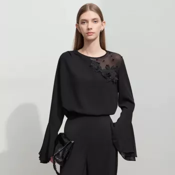 Chic Lace Flower Spliced Chiffon Blouse with Ruffled Cuffs for Women
