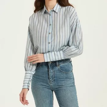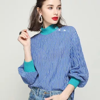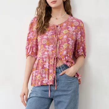 Elegant Floral Print Loose Blouse for Women with Stand Collar and Pearl Detail