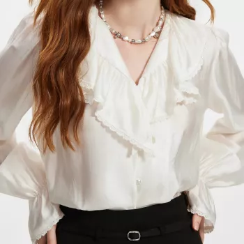 Elegant Beige Long Sleeve Ruffled Neck Blouse for Women