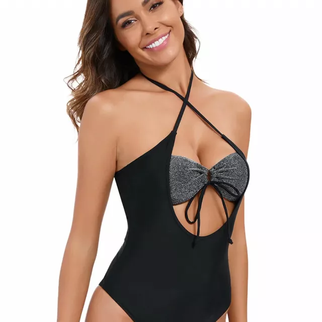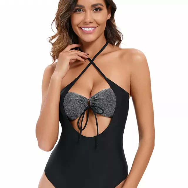 Its unique patchwork design and hollow-out details offer a blend of minimalism and allure. The halter neckline and backless cut add a sultry vibe, while the high-waist fit provides tummy control and accentuates your natural curves. Whether you’re lounging by the pool or diving into summer adventures, this one-piece brings together style and support in a striking way.
