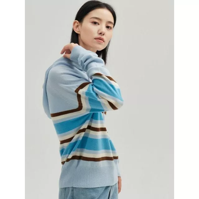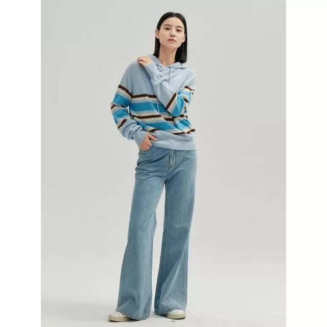 Embrace the cooler months in style with our Striped Hooded Blue Sweater, designed specifically for the modern woman who values comfort without compromising on style. Crafted from a luxurious blend of 25.6% cashmere and 74.4% wool, this sweater epitomizes the fusion of warmth and elegance. Its thick, regular yarn ensures durability and coziness, making it perfect for the autumn and winter seasons.