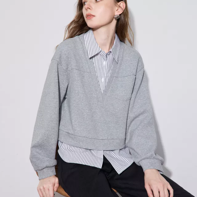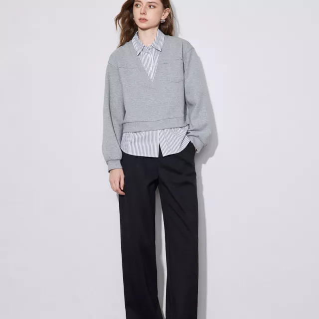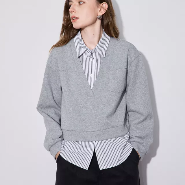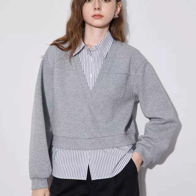 Looking for a winter wardrobe refresh? This sweatshirt is perfect for transitioning seamlessly from workwear to casual outings. The clever patchwork design creates a layered look, saving you the hassle of matching multiple pieces. Its soft cotton material keeps you warm, while the slight stretch ensures you stay comfortable all day long. The turn-down collar adds a sophisticated touch, making this piece a versatile staple for winter.