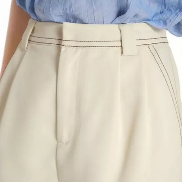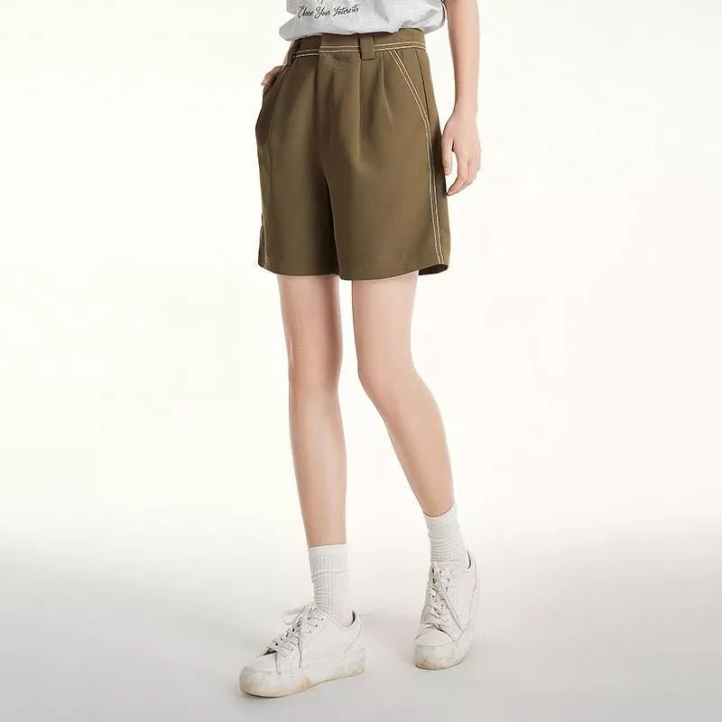 Our shorts come with a high waist design that flatters your figure, paired with a straight and loose fit that ensures comfort without compromising on style. The elegant twill fabric offers a smooth, luxurious feel, perfect for those hot summer days. The solid pattern, accentuated by contrasting lines, adds a unique touch to the otherwise classic design, making these shorts a versatile addition to your wardrobe.