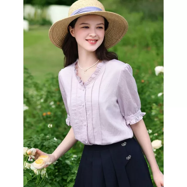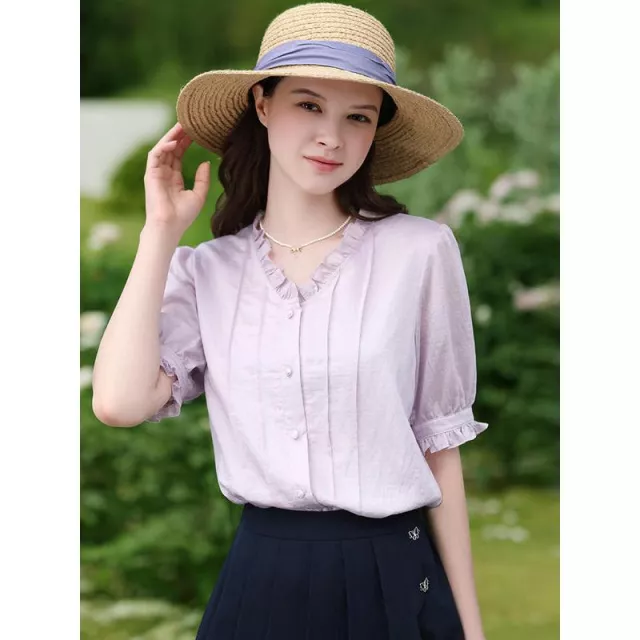 What makes this blouse special is its attention to detail and quality. From the carefully chosen fabric blend to the stylish puff sleeves and unique wood ear trim, every element is designed to offer both style and comfort.