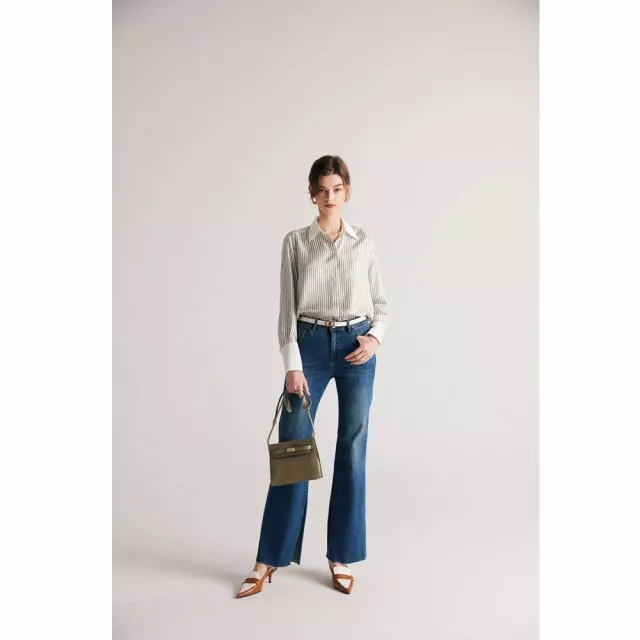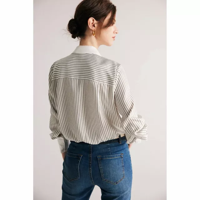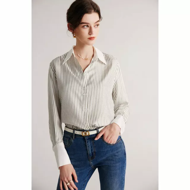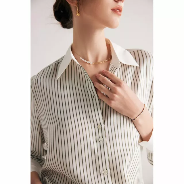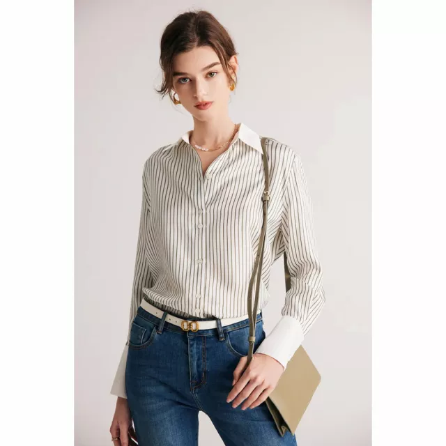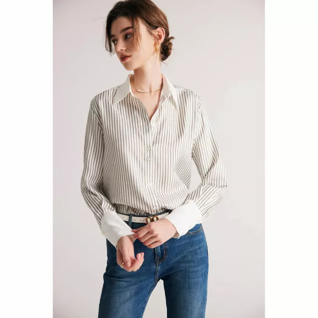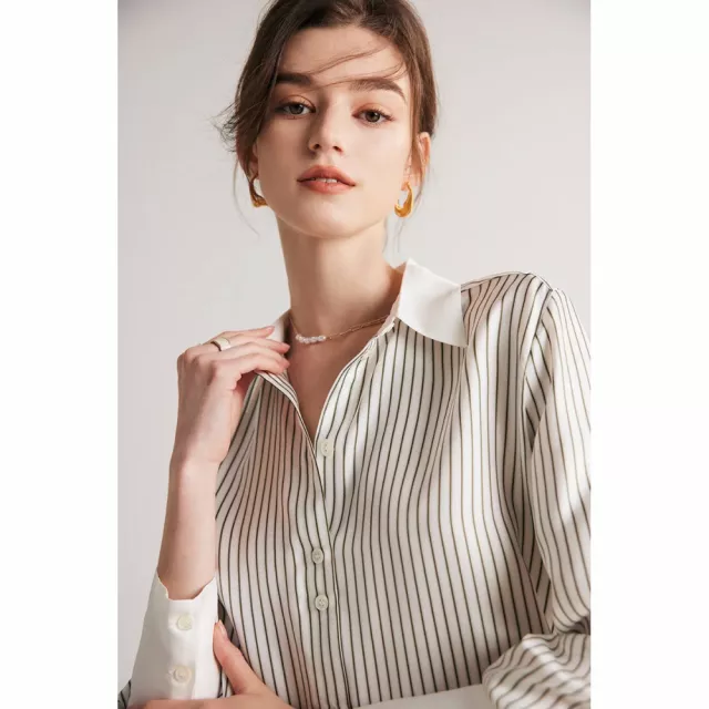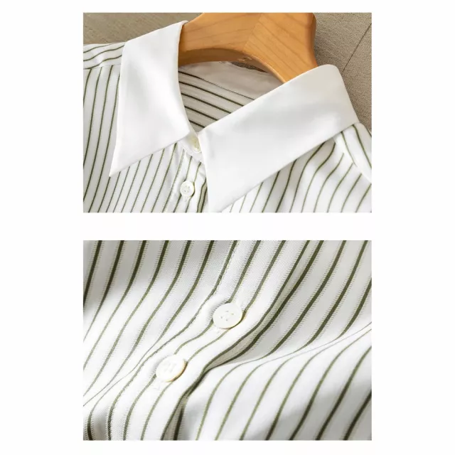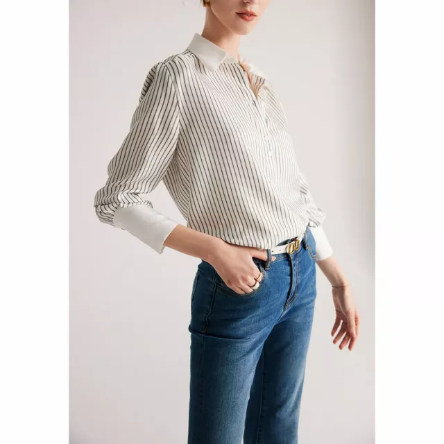 What sets this blouse apart is its commitment to quality and style. The use of 100% Mulberry silk not only ensures a premium feel but also provides a garment that’s built to last. Its elegant striped design and chic single-breasted closure offer a timeless appeal, while the detailed printing decoration adds a modern twist. Moreover, its all-season versatility and breathable fabric make it an invaluable addition to any wardrobe.
