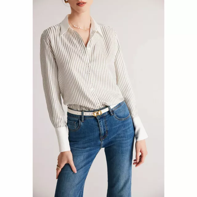 Introducing our latest addition to your wardrobe essentials – the Chic Striped Silk Blouse, perfect for the spring and summer wardrobe. Designed with sophistication and comfort in mind, this blouse is your go-to for any occasion, blending seamlessly into both your office and casual wardrobes. Crafted from 100% Mulberry silk, the fabric promises a luxurious feel against your skin while ensuring durability and a lustrous appearance.