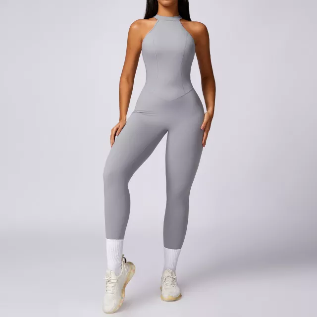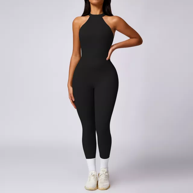 The modern and sleek design features a stunning V-back cut that allows for freedom of movement while offering a touch of sophistication. Made from a high-quality nylon and spandex blend, this jumpsuit provides excellent stretch and support, hugging your body in all the right places. The breathable fabric wicks away sweat, keeping you cool and comfortable through every rep or stretch.