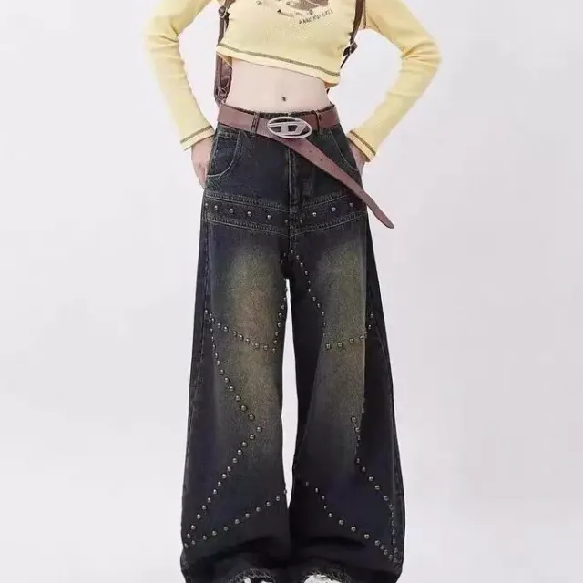 Vintage Distressed Wide-Leg Jeans with Rivet Accents