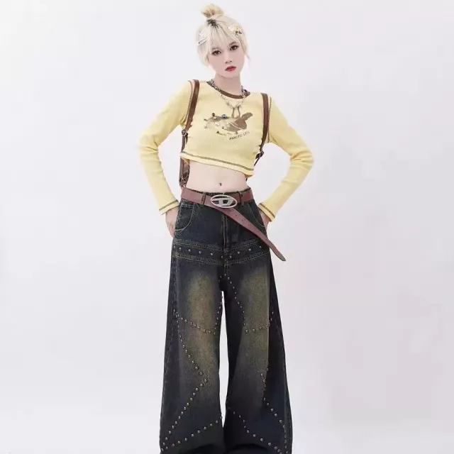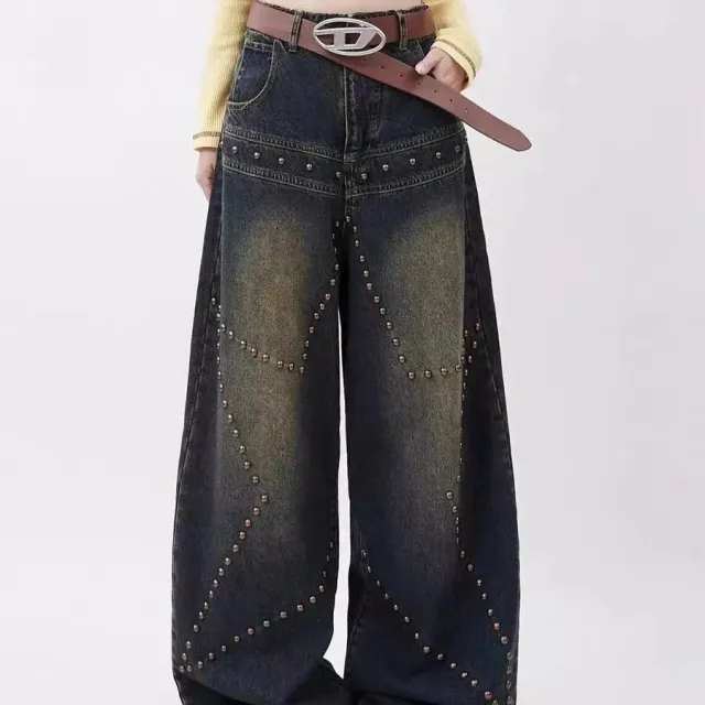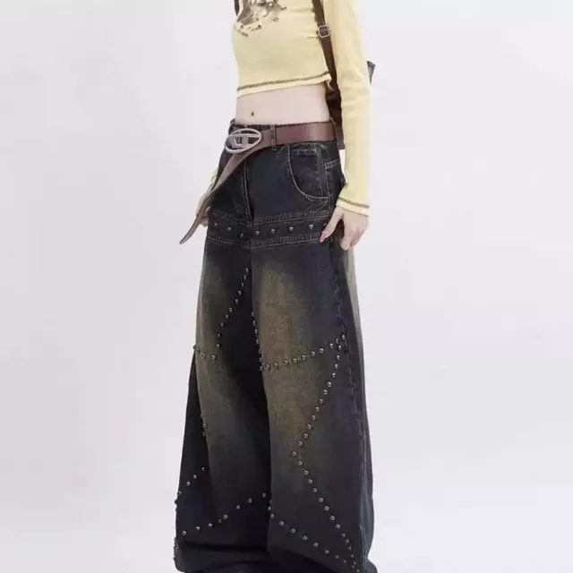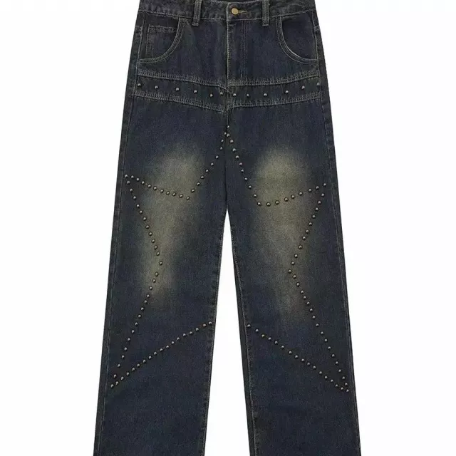 Each pair is a canvas of creativity, showcasing a washed and weathered look complemented by distinctive rivet decorations. The high-waisted cut not only enhances your figure but also offers unmatched comfort for day-long wear. Made from premium polyester with a hint of stretch, these jeans prioritize both style and flexibility. The full-length wide-leg design allows for versatile styling with your favorite footwear, from classic boots to chic sneakers.