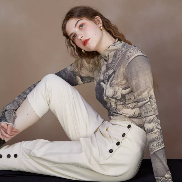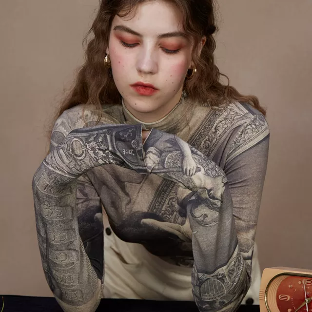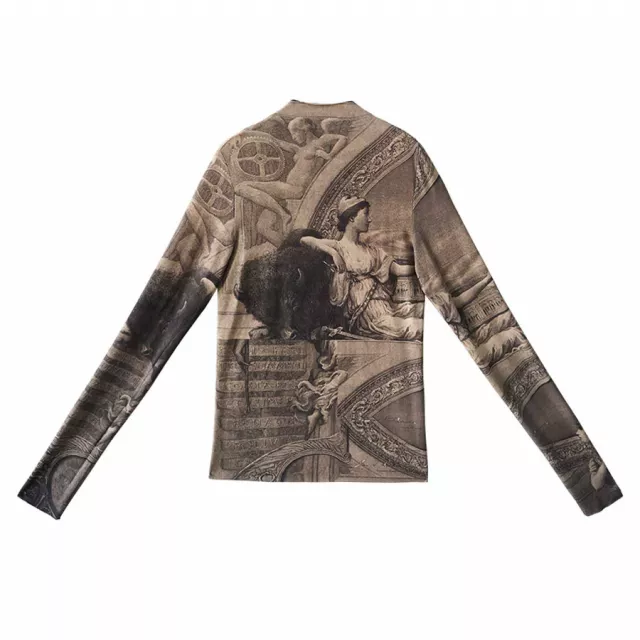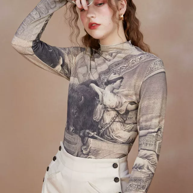 Introducing the ultimate blend of elegance and comfort: the Vintage Oil Painting Print Slim Fit Turtleneck T-shirt. This versatile and stylish piece is designed for the modern woman who loves vintage-inspired fashion with a contemporary twist. Perfect for chilly autumn and winter days, this t-shirt offers a unique combination of soft, breathable cotton and high-stretch spandex to keep you feeling great all day long.