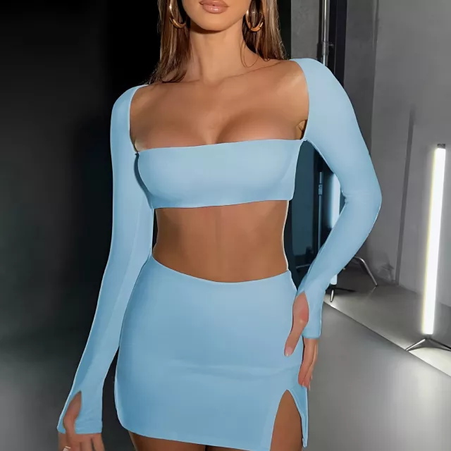 This head-turning outfit is crafted from a premium blend of polyester and spandex, offering just the right amount of stretch for a snug yet comfortable fit. The long sleeve crop top features a stylish square collar that gives a modern and edgy touch to your look, while the drawstring mini skirt sits above the knee, sculpting your waistline beautifully. With a knit weave and natural fiber composition, the fabric feels soft against your skin while staying breathable and light for all-night wear.