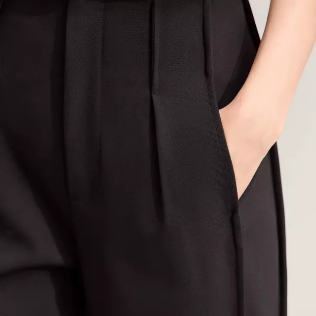 These solid-colored ankle-length pants feature subtle yet stylish details, including pleats for added structure and functional side pockets for everyday convenience. The tapered leg creates a modern “radish” shape, offering a sophisticated yet laid-back vibe. Whether paired with a blouse and heels or a sweater and flats, these pants adapt effortlessly to any occasion.