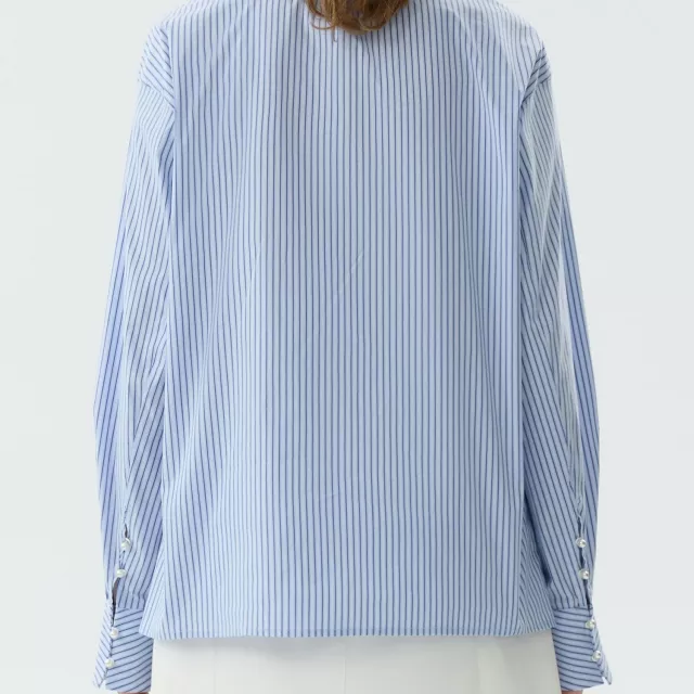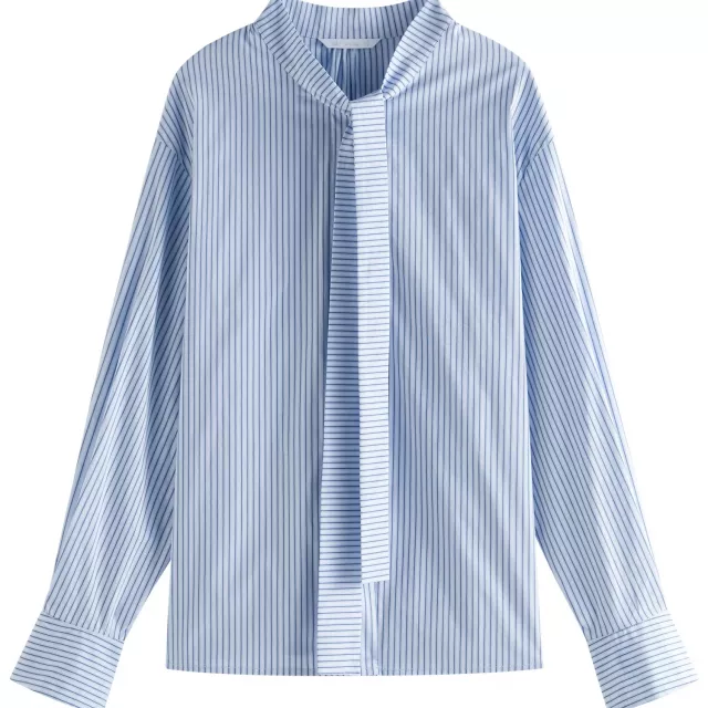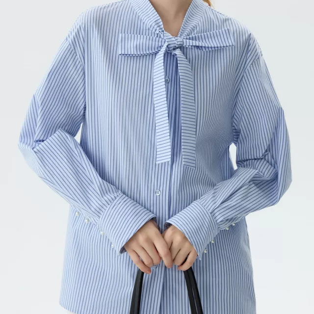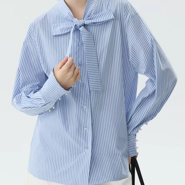 Women’s Blue and White Stripe Bow Collar Cotton Long Sleeve Blouse