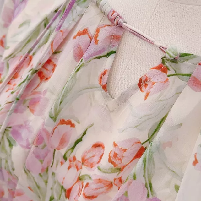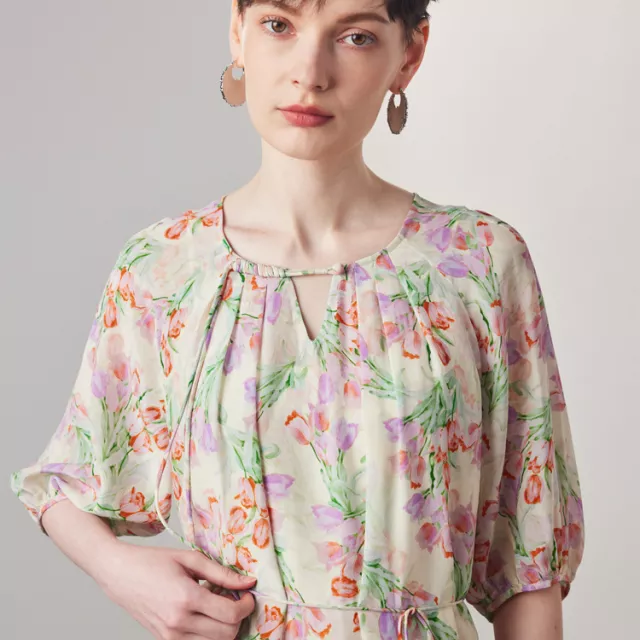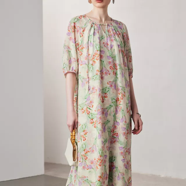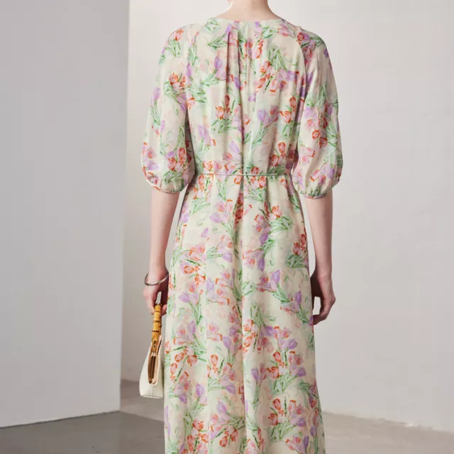 This floral silk dress is designed to be as versatile as it is stylish. The raglan sleeves provide a unique twist to the classic dress style, while the floral print adds a touch of springtime charm. Whether you’re heading to a casual brunch, an office meeting, or a garden party, this dress is the perfect choice. Its mid-calf length makes it ideal for any occasion, while the O-neck ensures a sophisticated and flattering look. The luxurious mulberry silk fabric makes this dress feel as good as it looks, allowing you to enjoy both comfort and style all day long.