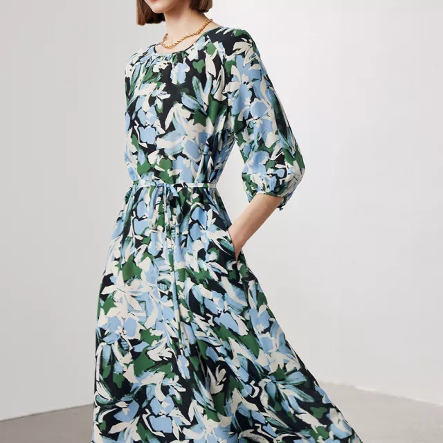 This floral silk dress is a statement piece that embodies effortless sophistication. Its natural silk composition ensures a luxurious feel, while the breathable fabric makes it ideal for spring days. The classic yet modern design is perfect for women who appreciate understated elegance, making it a staple in any wardrobe.