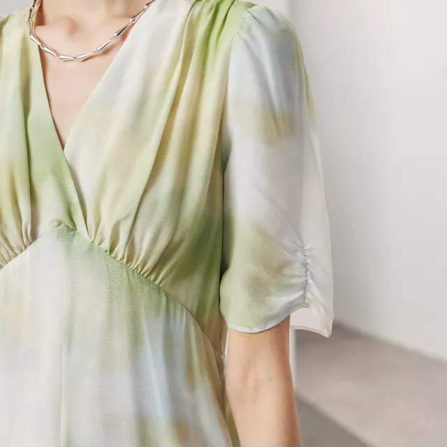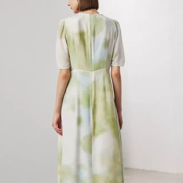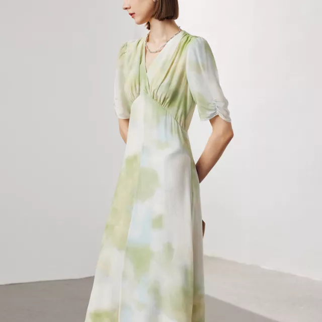 This green printed silk dress stands out for its luxurious material, elegant design, and versatility. The V-neck and A-line silhouette come together beautifully to create a flattering and sophisticated look that works well for a variety of occasions. The empire waistline provides a comfortable fit, while the printed design adds a lively, nature-inspired touch perfect for spring.