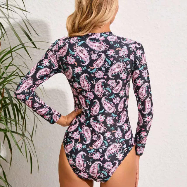 Whether you’re hitting the surf, swimming laps, or lounging poolside, this sleek and sporty one-piece swimsuit is your go-to for all things water. Designed for active women who demand both performance and style, this long sleeve bodysuit-style swimwear blends athletic function with modern flair. The striking printed design and figure-flattering silhouette will make you feel confident and powerful, both in and out of the water.