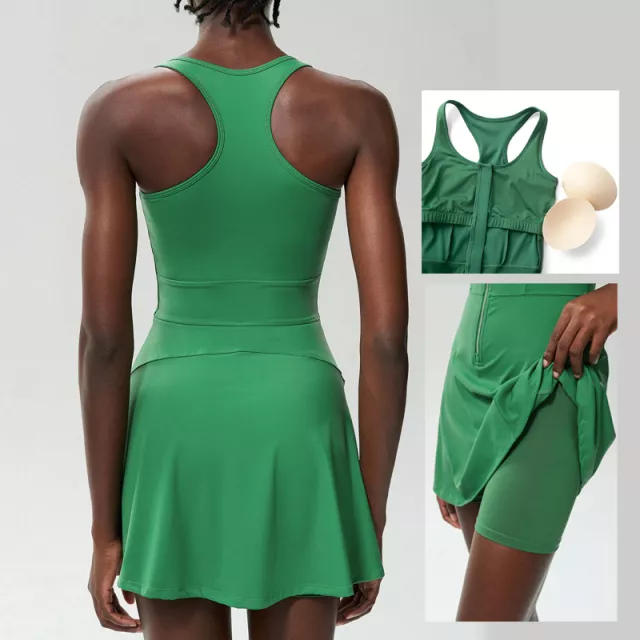 Crafted with a breathable blend of nylon and spandex, the fabric is soft, stretchy, and quick-drying — perfect for high-energy workouts or all-day wear. Its sleeveless design and above-knee mini skirt length offer maximum freedom of movement and an effortlessly chic silhouette. Ideal for tennis, running, yoga, gym sessions, or even casual outings, this all-in-one piece is a staple for every active woman’s wardrobe.