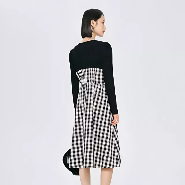 Crafted from a premium blend of polyester and spandex, this dress provides a slight stretch for all-day comfort while maintaining its structured, tailored fit. The plaid splice detail adds a unique and stylish contrast, enhancing the dress’s overall aesthetic. With a mid-calf length, this dress is perfect for transitioning through seasons, making it an ideal choice for autumn outings, office wear, or elegant evening gatherings.