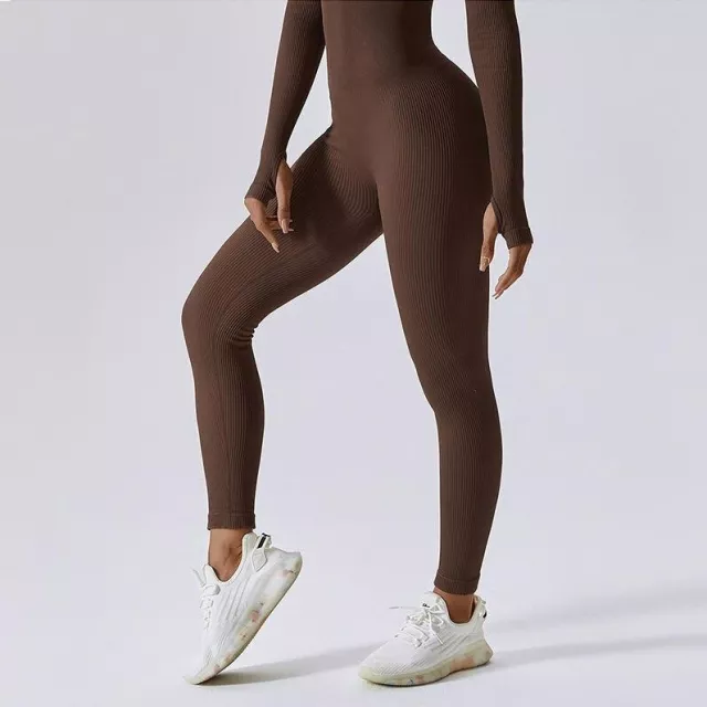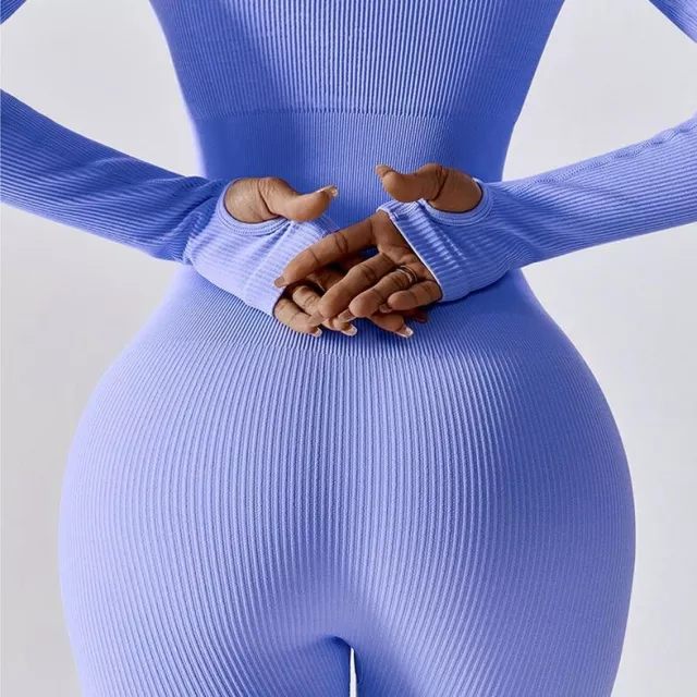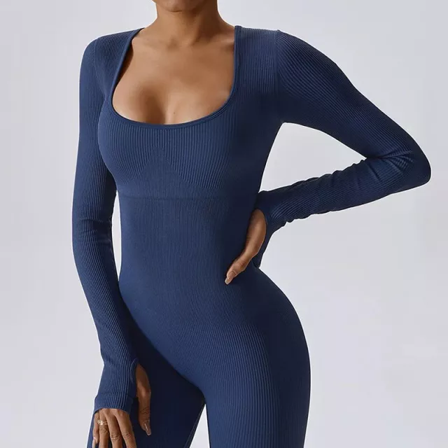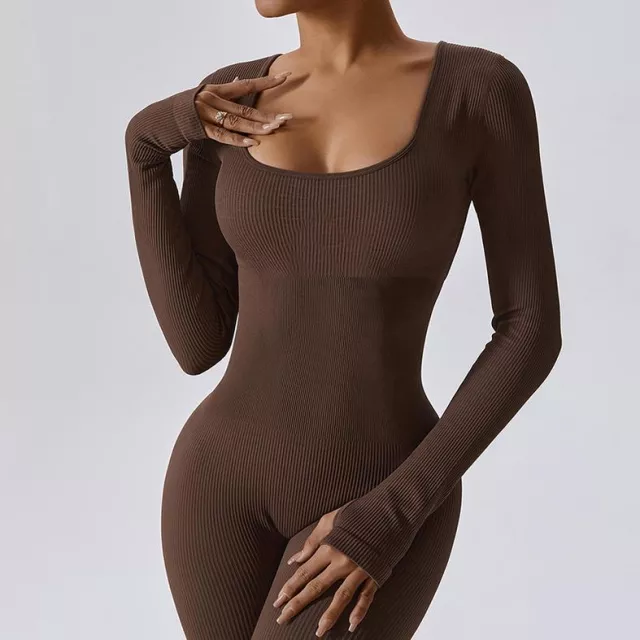 Step into your workout regime with confidence and style with our Women’s Ribbed Yoga Jumpsuit. Designed to offer the perfect blend of style and functionality, this one-piece workout romper elevates your fitness wardrobe. Its square neck and long sleeves complement the ribbed detailing, creating a look that’s both fashionable and functional.