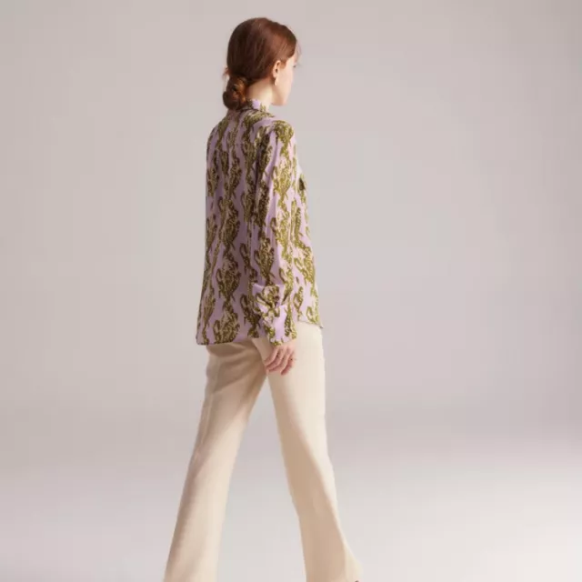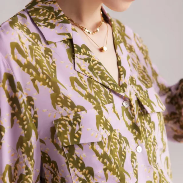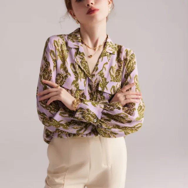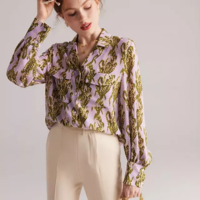 The blouse’s 100% silk construction sets it apart, offering a luxurious feel that elevates any outfit. Its notched neckline and chest pockets provide a modern twist on a classic design, ensuring it stands out in any wardrobe. The elegant print adds character without being overpowering, making it easy to pair with a wide range of bottoms and accessories. Whether you’re dressing up or keeping it casual, this blouse’s combination of comfort, style, and sophistication makes it a standout piece.