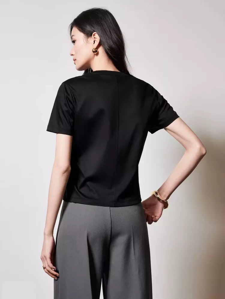This T-shirt is perfect for any occasion that calls for easy, chic styling. Its simple design makes it an excellent choice for casual outings, from a day of shopping to brunch with friends. Pair it with denim for a laid-back look or dress it up with accessories for a more polished feel. Its breathable material also makes it a great option for warmer weather, keeping you cool and stylish no matter the season. Whether you’re heading to the office or out for a weekend adventure, this T-shirt has you covered.
