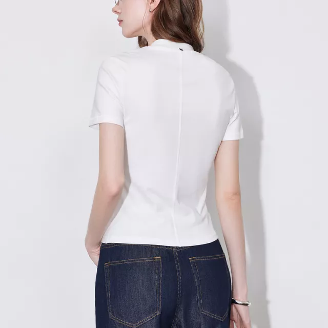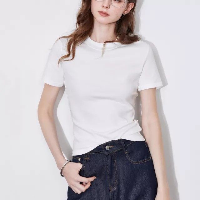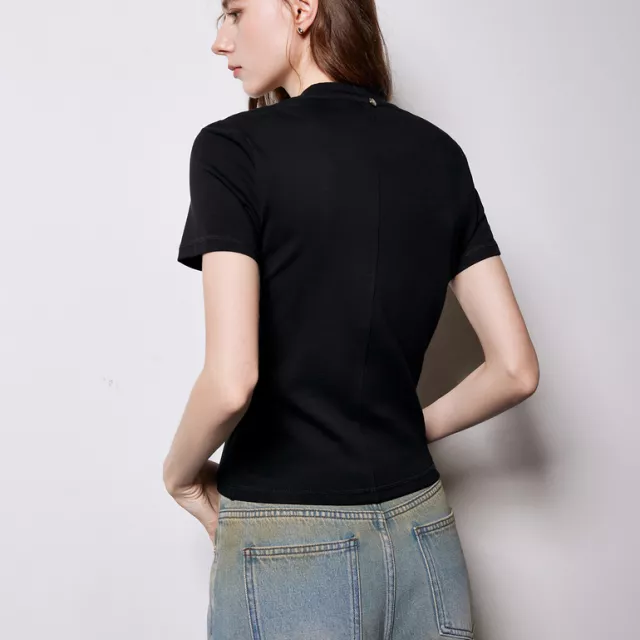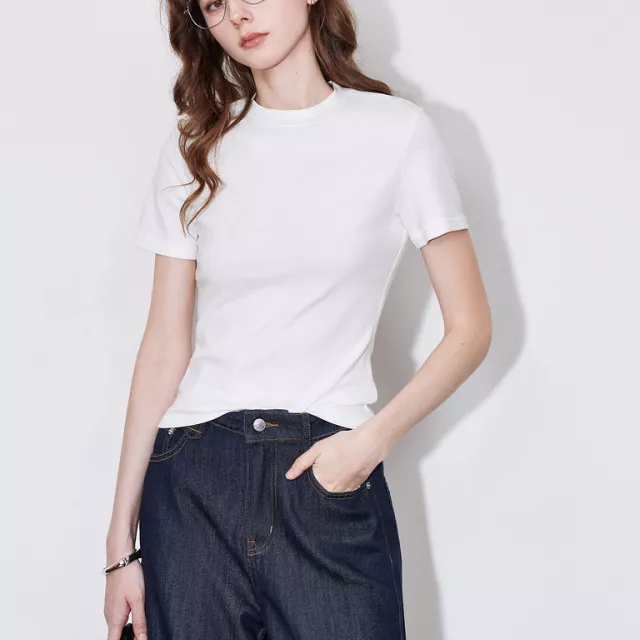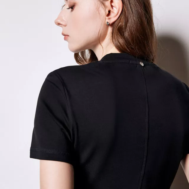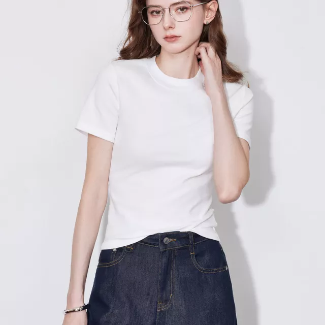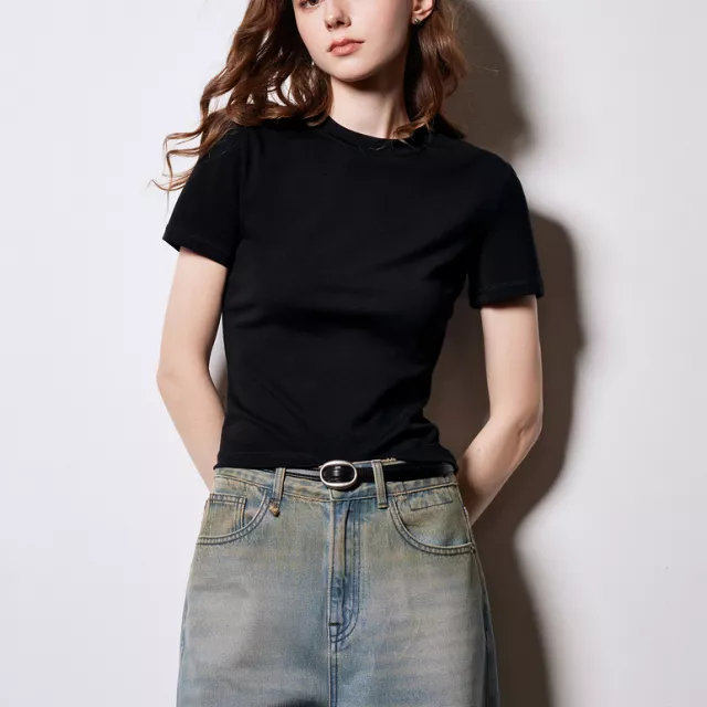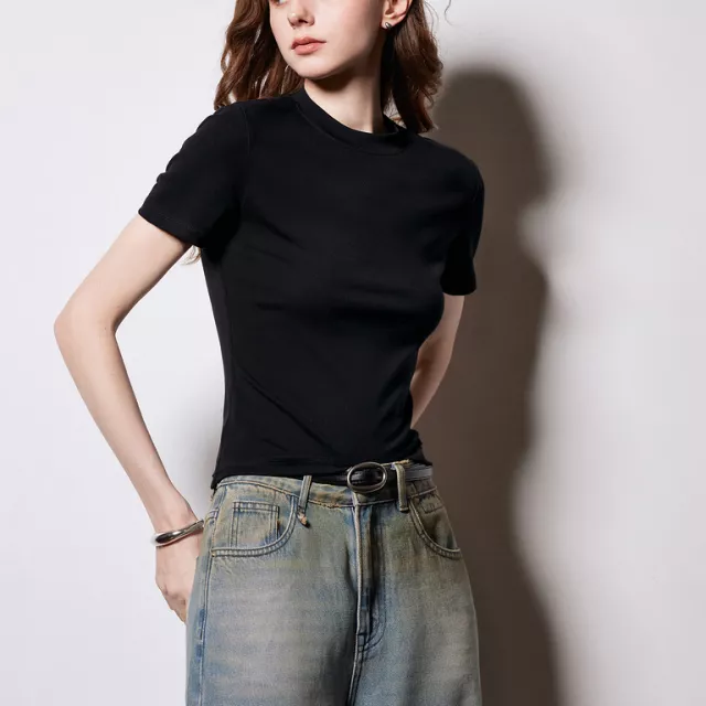The beauty of this T-shirt lies in its minimalist yet sophisticated design. Featuring a solid color and a sleek, tailored fit, it pairs effortlessly with skirts, jeans, trousers, or even layered under a blazer for a polished office look. The jersey knit fabric offers high stretch, ensuring a comfortable yet form-fitting style that moves with you throughout the day.