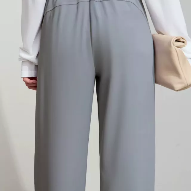 Made from a high-quality blend of polyester and spandex, these pants are soft, breathable, and slightly stretchy for all-day comfort. The laminated fabric drapes effortlessly, creating a smooth and flattering appearance. The mid-rise elastic waistband ensures a secure yet flexible fit, making these trousers ideal for all body types.