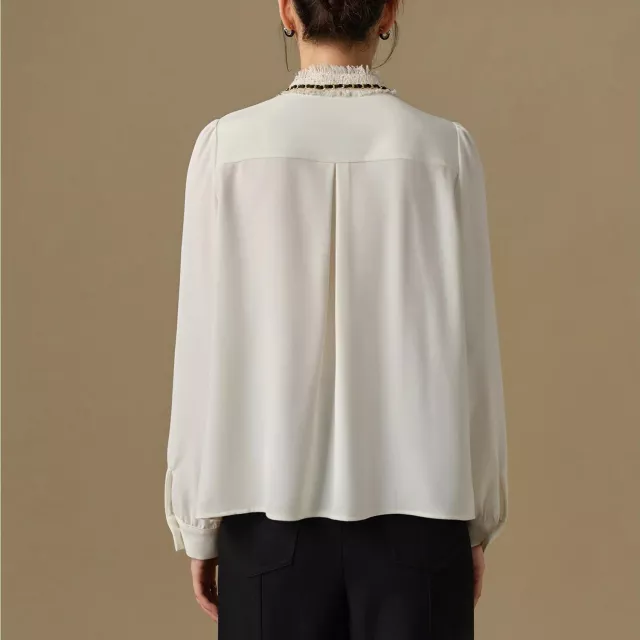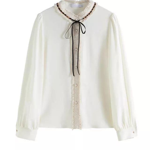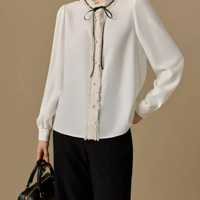 What sets this blouse apart is its sophisticated patchwork design, blending tweed patterns with a polished twill finish. The stand collar and puff sleeves add an air of refinement, making it a versatile piece for your wardrobe. Pair it with trousers or skirts for a complete, chic look.